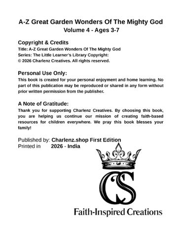 A-Z Great Garden Wonders of the Mighty God Discover God’s Garden from A to Z! Introduce your "Little Learner" to the colorful world of fruits and vegetables! Volume 4: Great Garden Wonders is a faith-inspired coloring and handwriting adventure designed specifically for children ages 3–7. From the "A" of a crunchy Apple to the "X" of a striped Xigua, every page is a celebration of God’s wonderful creation. This book isn't just about coloring; it’s about growing Wise Minds, Strong Bodies, and Faithful Hearts. What’s Inside: 26 Unique Garden Wonders: Large, bold outlines of fruits and veggies—perfect for tiny hands and big crayons! Handwriting Practice: Clean lines for tracing and writing to help build early literacy skills. Action Facts & Faith Sparks: Every letter includes a fun fact about the plant and a "Faith Spark" to remind your child of God’s love and power. Visual Guides: Small colored samples on every page to inspire your little artist. Perfect for: Homeschooling families looking for faith-based resources. Sunday School activities or quiet time at home. Birthdays, holidays, or "just because" gifts for toddlers and preschoolers. SPECIAL OFFER: Love the series? Get the digital version and start coloring instantly! Visit Https://charlenz.shop to get 50% OFF all digital downloads. Print your favorite pages as many times as you like and keep the learning going!
