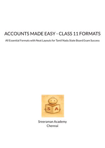 Accounts Made Easy – Class 11 Formats is a concise reference book containing all essential Accountancy formats required for the Tamil Nadu State Board syllabus. Designed for quick revision and easy reference, it helps students present answers clearly and confidently in examinations.
