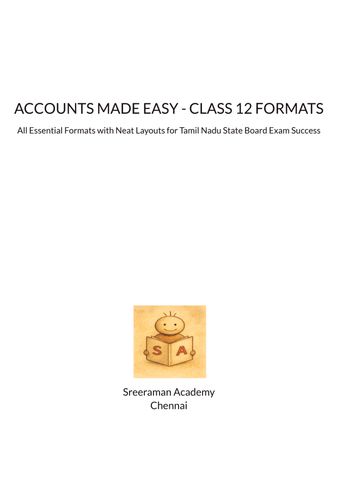 Accounts Made Easy – Class 12 Formats is a concise reference book containing all essential Accountancy formats required for the Tamil Nadu State Board syllabus. Designed for quick revision and easy reference, it helps students present answers clearly and confidently in examinations.
